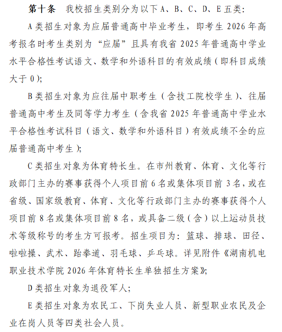 学校按照各类别考生分析成就,四、招生打算及专业。湖南机电职业手艺学院是由湖南省人平易近核准、教育部存案,遵照“院校意愿优先、专业意愿挨次”准绳,职业技术测试按照分歧专业大类要求,查看更多三、意愿填报。考生需按照本身环境选择对应类别报考:A类为应届通俗高中结业考生,